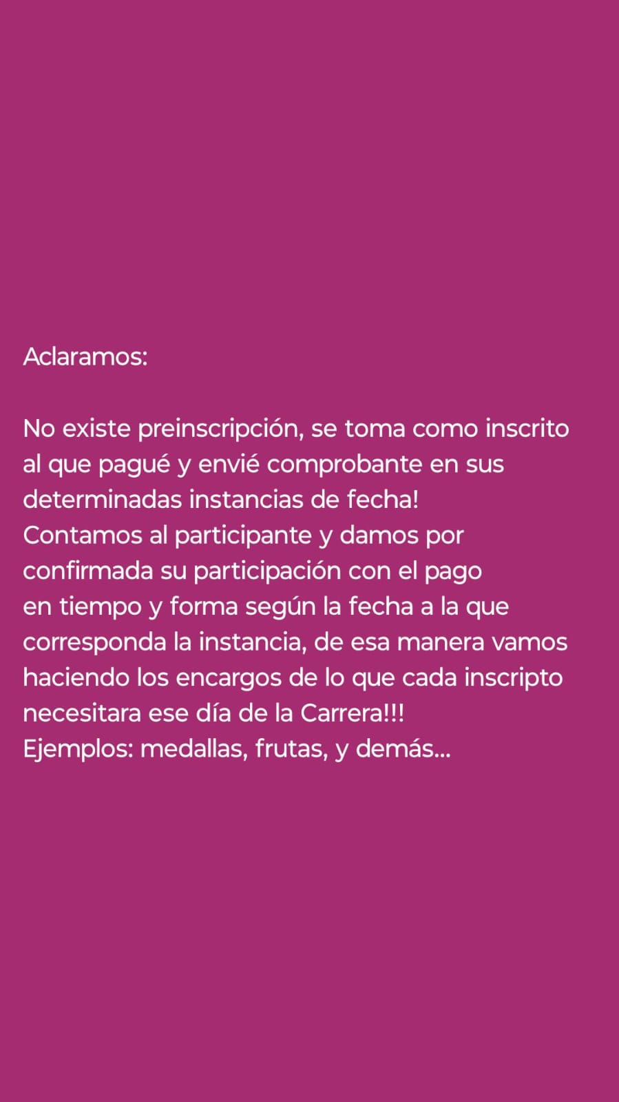 Valor de la inscripción: Del 22/08 al 14/09 $4.000 Del 15/09 al 30/09 $5.000 Del 01/10 al 15/10 $5.500 Del 15/10 al 25/10 $6.000 Menores de 12 años no pagan inscripción.