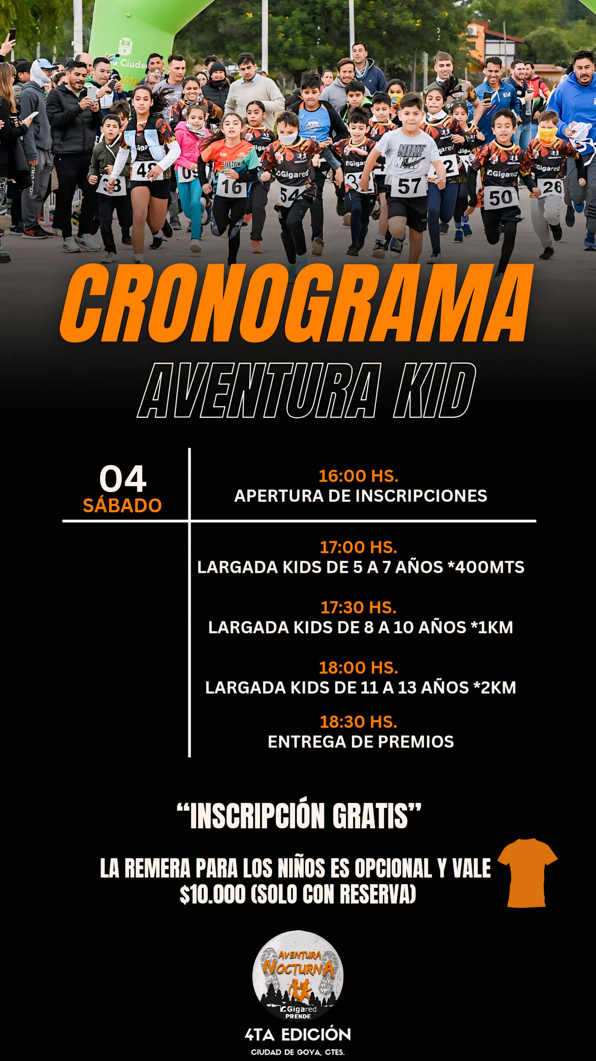 AVENTURA KID Ese mismo día, en horario de la tarde se realizara una carrera para niños, totalmente gratuita. Este evento para los infantes contara con 3 distancias acordes a cada grupo de edad. 400 m entre 5 y 7 años, 1km entre 8 y 10 años y 2km entre 11 y 13 años. Estos 3 grupos se clasificaran en niñas y niños. Se entregaran medallas finisher para todos los participantes y se premiara con atriles a los 5 primeros de cada categoría.
